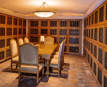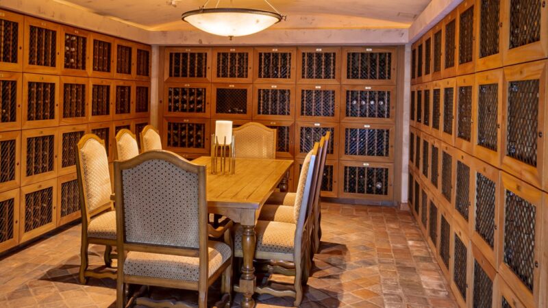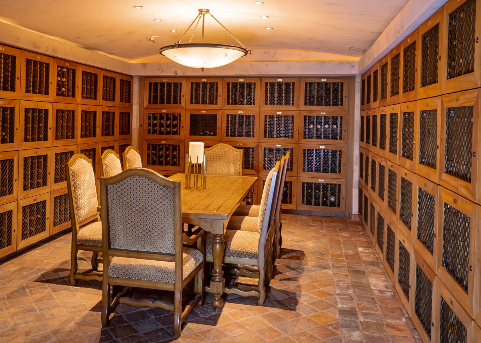 The gourmet island kitchen is a chef’s dream, featuring Absolute granite countertops, GE Monogram appliances, a 6-burner gas cooktop with griddle, Sub-Zero refrigerator, wine fridge, and double ovens.
