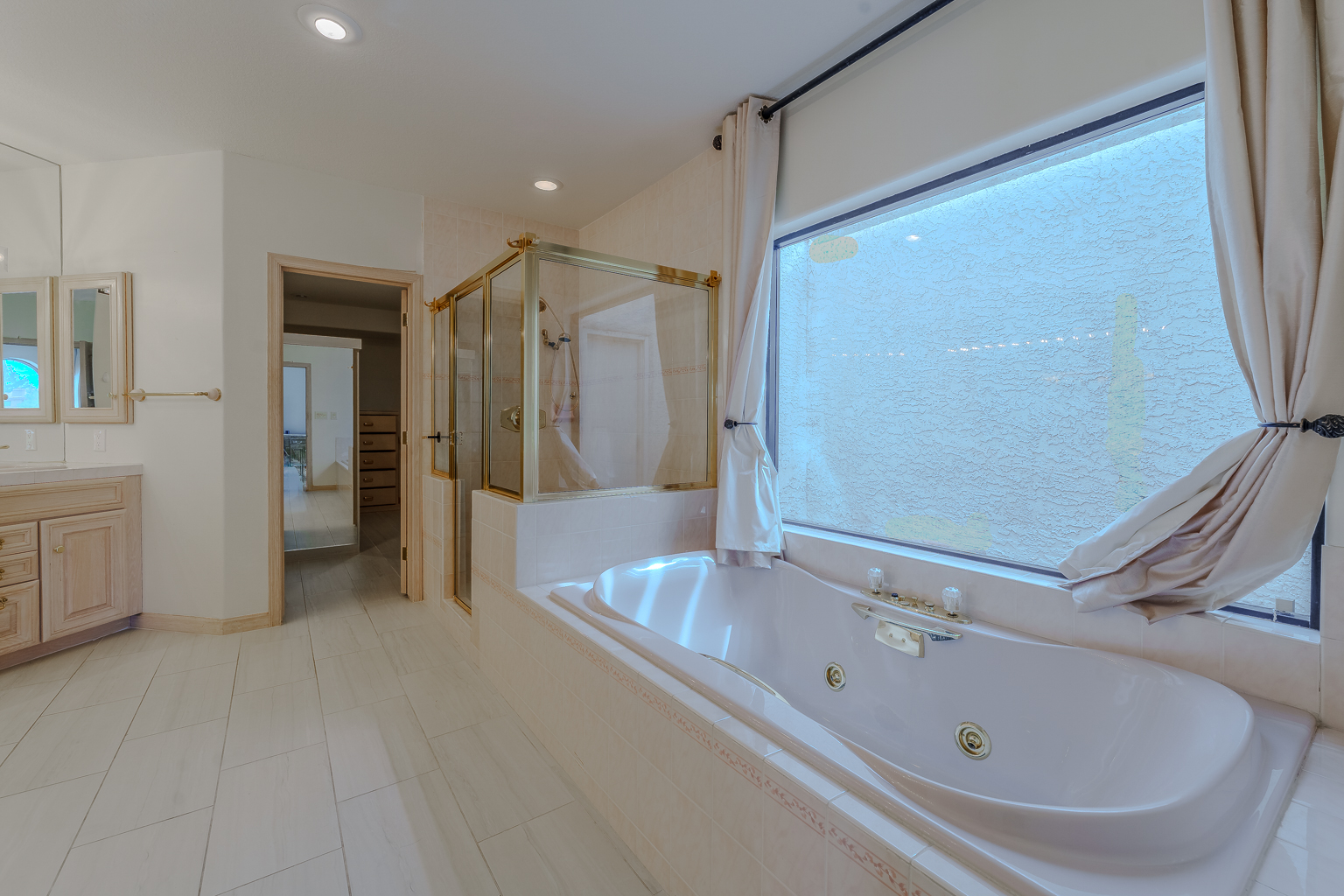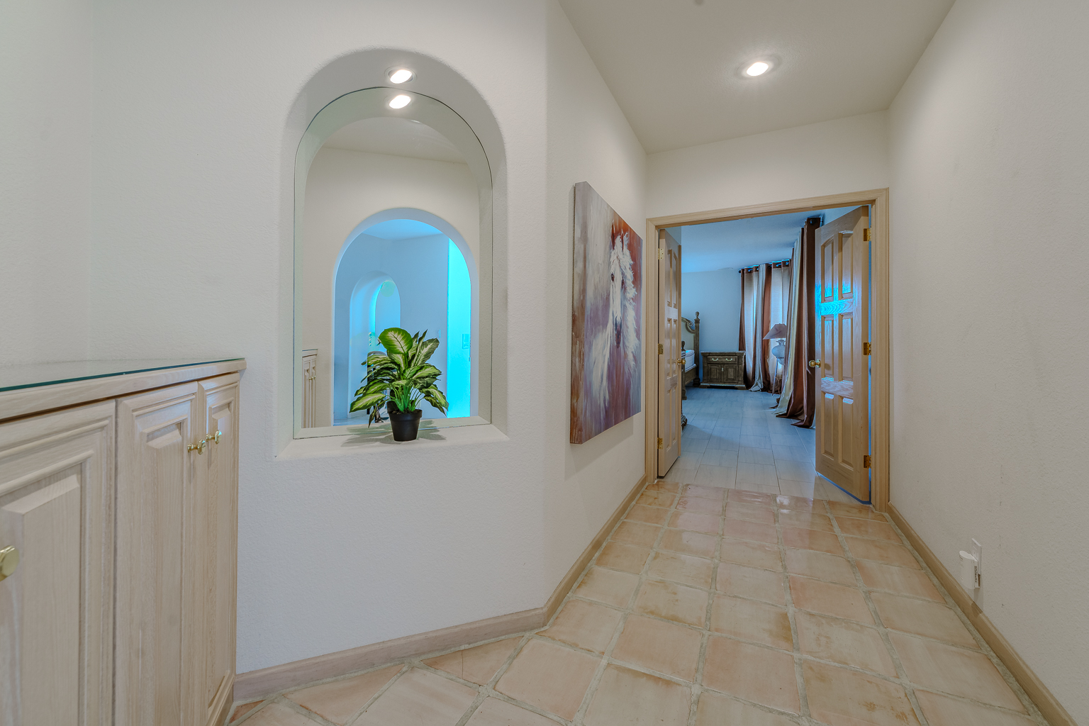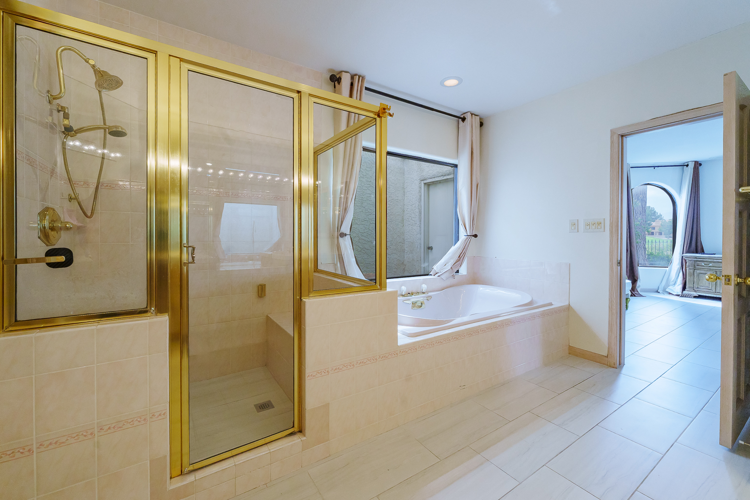 - Exterior features: Architecture Style: Two Story, Attached, Bedroom on Main Level, Ceiling Fan(s), Central Vacuum, Floor Covering: Ceramic, Flooring: Ceramic, Garage, Garage Door Opener, Gated, Guard, Inside Entrance, Pool, Primary Downstairs, Private, Security System, Security System Owned, Storage, Tennis Court(s), Walk In Closet, Water Softener Owned, Window Treatments