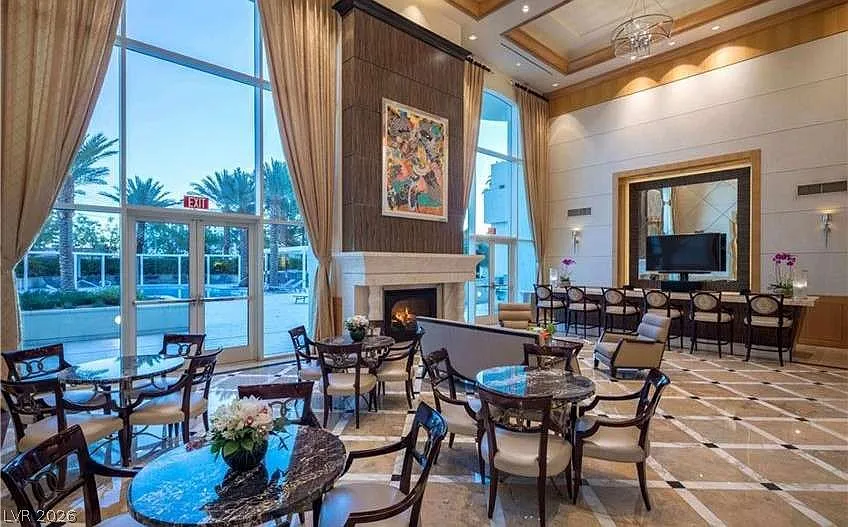 Breathtaking Vistas: Floor-to-ceiling windows and glass doors frame panoramic Strip views, flooding the great room with natural light.
