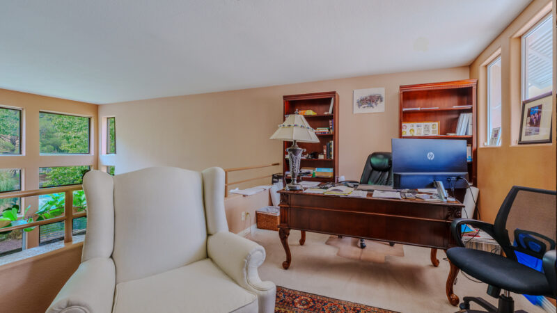 This stunning waterfront end unit offers a rare model with extra windows and a spacious greenbelt between the homes. It features an additional loft upstairs, providing over 1,900 square feet of living space. The layout includes a den on the lower level and a two-story volume ceiling with upper windows. The primary bedroom is located on the ground floor, overlooking the lake, while the second bedroom is situated upstairs with its own bath.