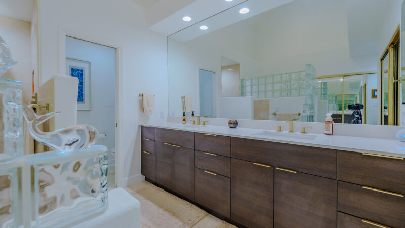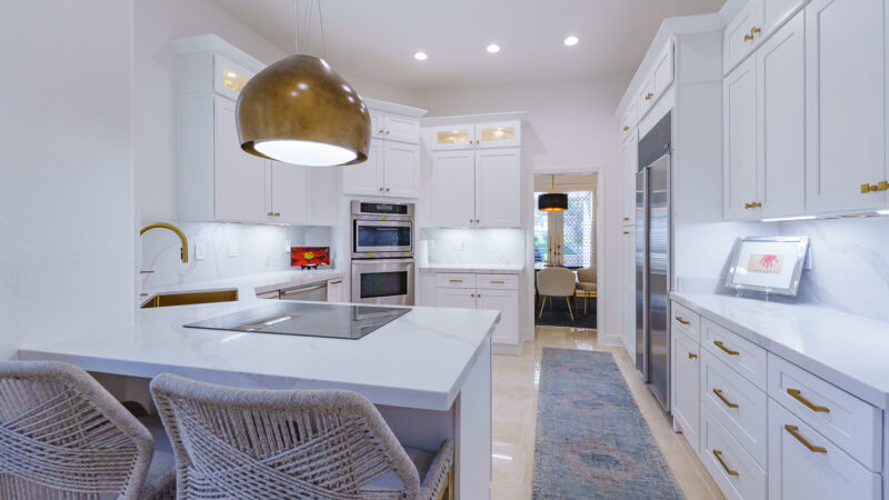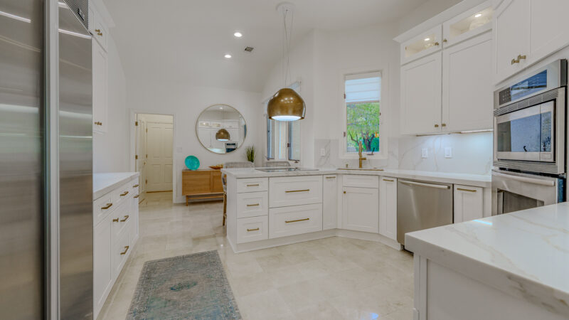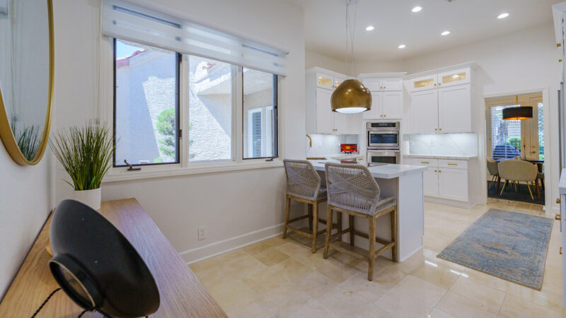 Over $150,000 in recent updating. The new kitchen features custom lighted glass cabinets, Quartz counters, Monogram Induction cooktop, Thermador oven and microwave, Bosch dishwasher, Sub Zero, undermount sink, new faucet and pull out drawers. One story (no steps). Marble floors. Vaulted ceilings. 2 fireplaces. Shutters. Enlarged walk out shower in primary bath. Garage has separate storage room. Enclosed tiled courtyard and patio. On cul-de-sac. On the greenbelt.