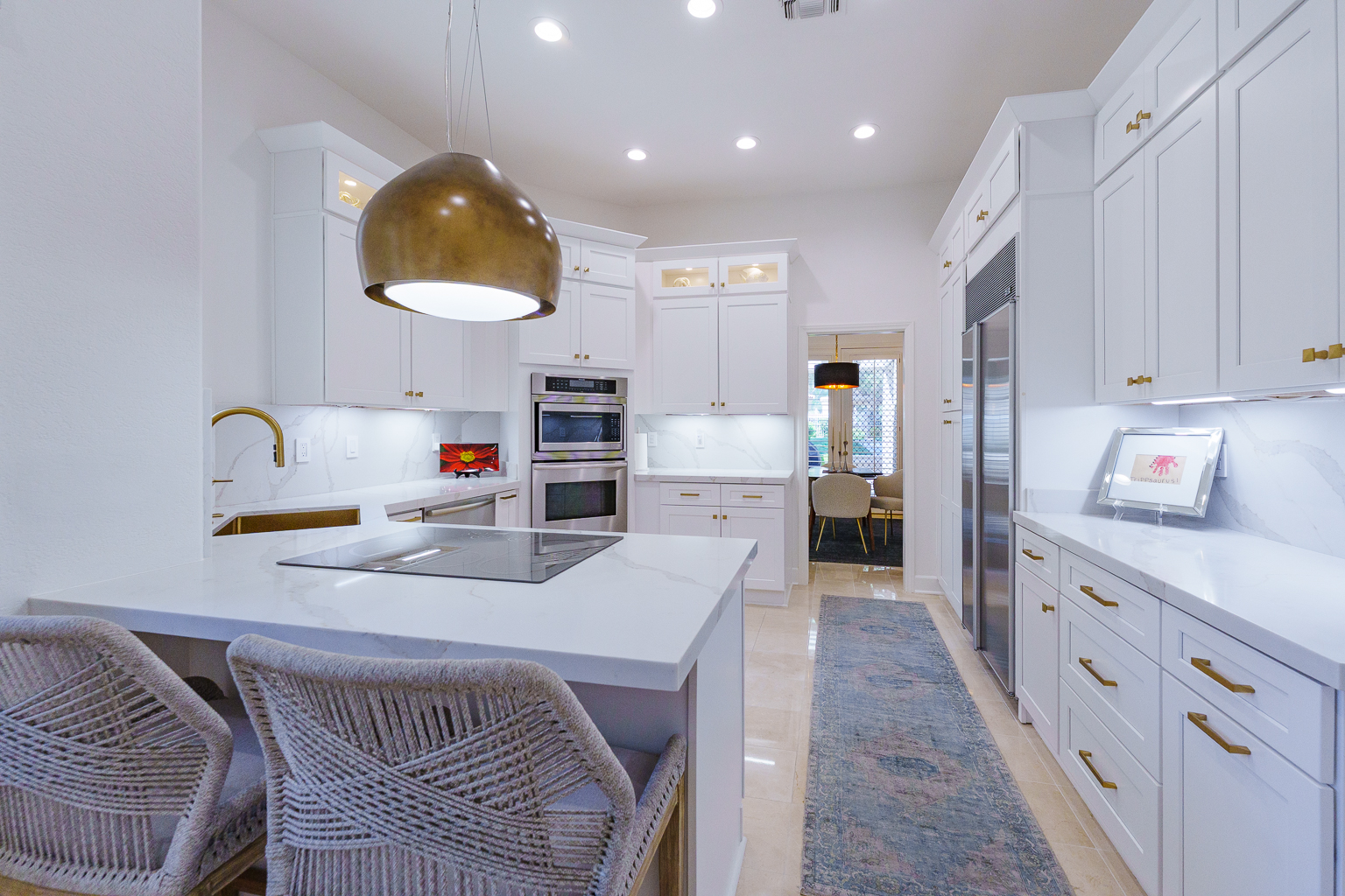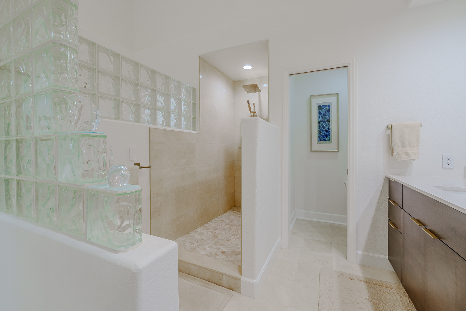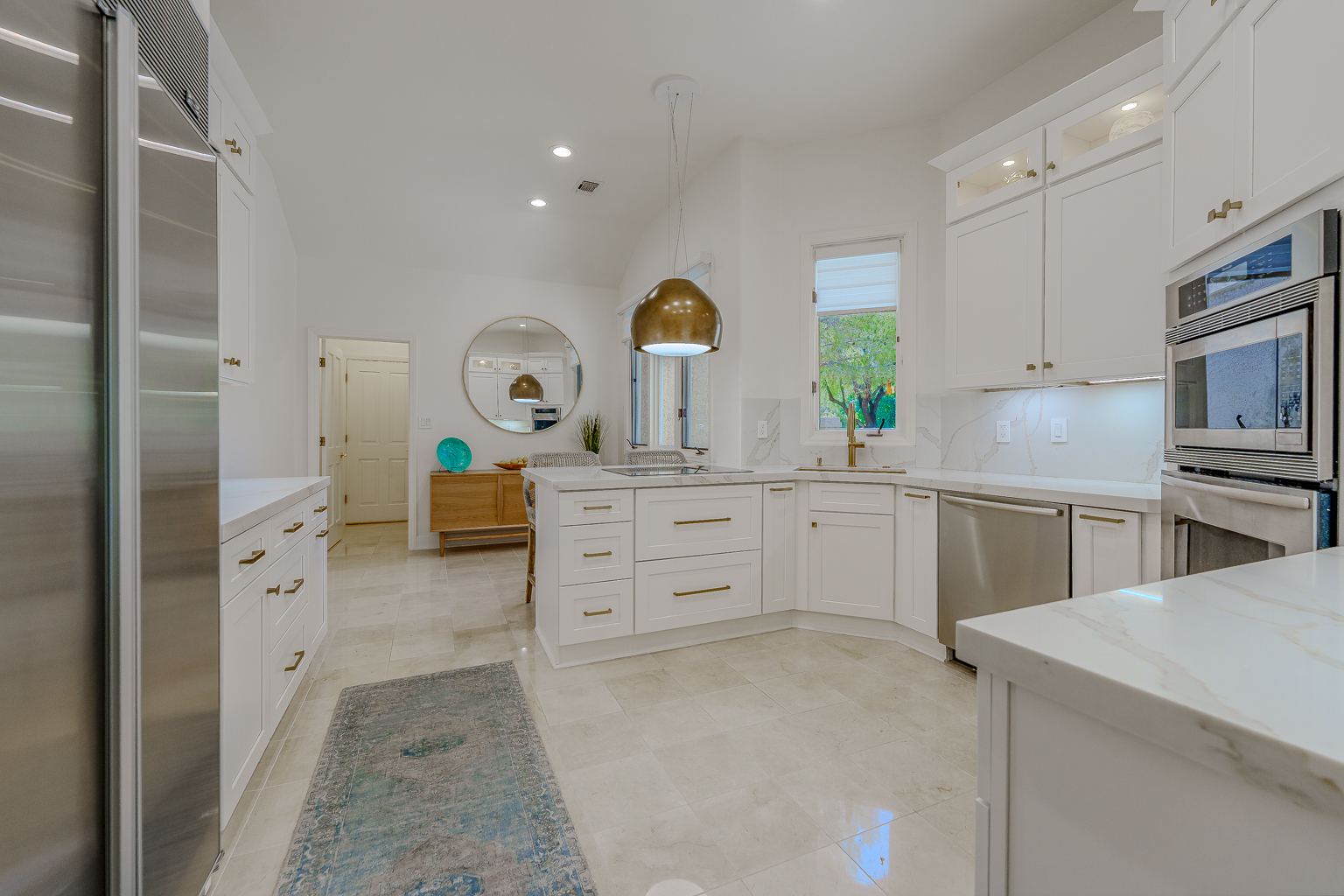 Over $150,000 in recent updating. The new kitchen features custom lighted glass cabinets, Quartz counters, Monogram Induction cooktop, Thermador oven and microwave, Bosch dishwasher, Sub Zero, undermount sink, new faucet and pull out drawers. One story (no steps). Marble floors. Vaulted ceilings. 2 fireplaces. Shutters. Enlarged walk out shower in primary bath. Garage has separate storage room. Enclosed tiled courtyard and patio. On cul-de-sac. On the greenbelt.