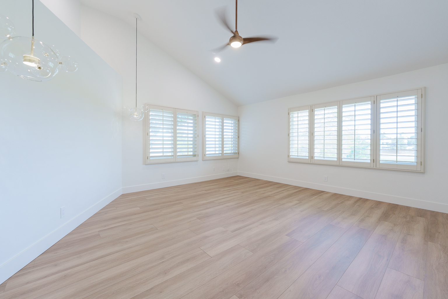 This stunning remodel overlooks the double fairway of a golf course and estate homes. It features dramatic two-story volume ceilings and upper windows, new flooring, and custom lighting. The doors have all been replaced, and the entire space has been freshly painted.