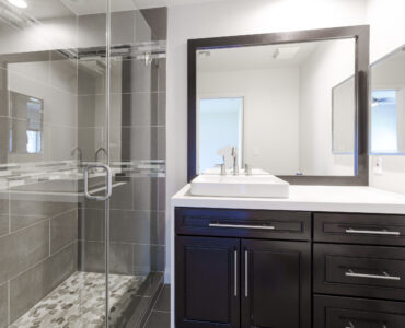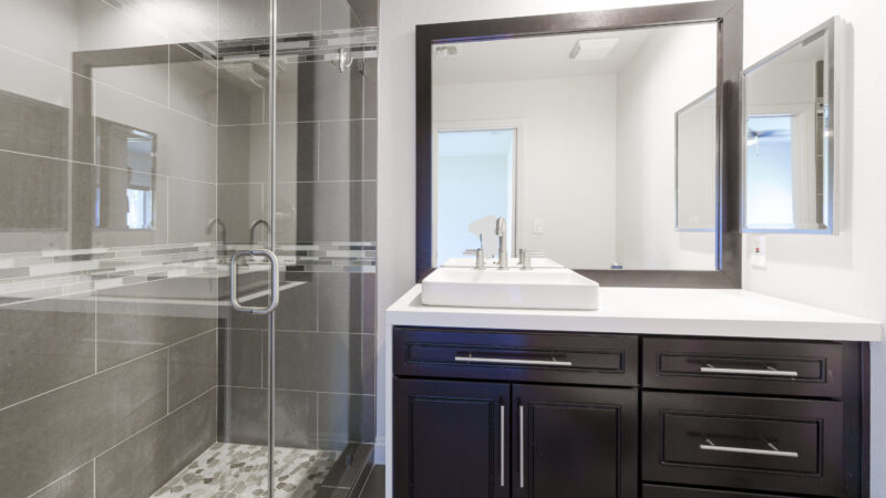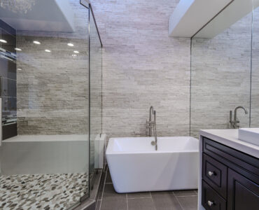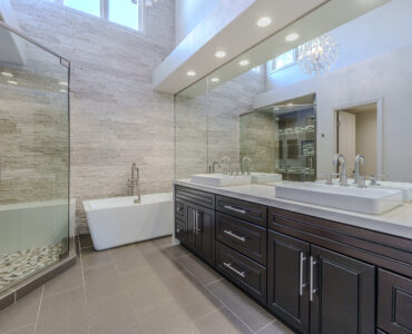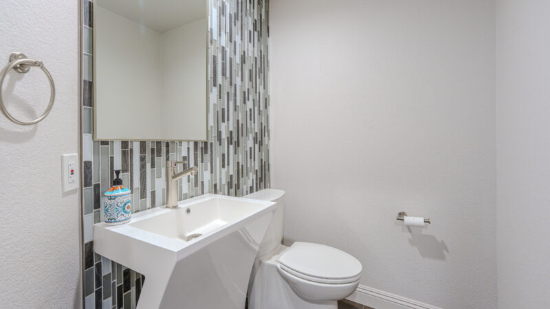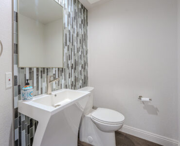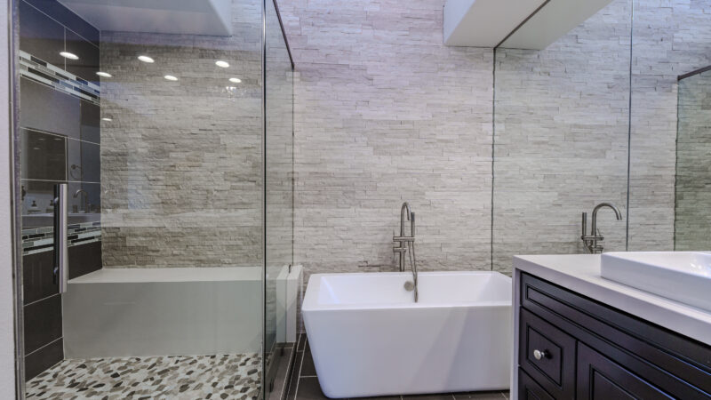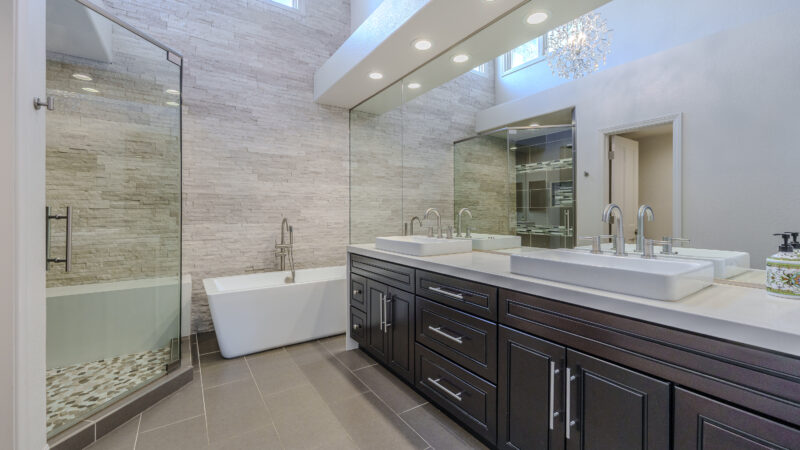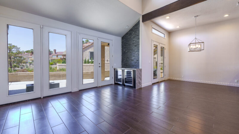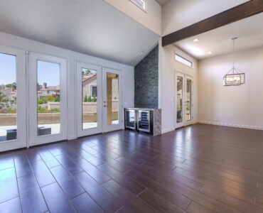With vaulted ceilings and custom lighting, the space feels open and inviting. The gourmet kitchen is designed for modern living, boasting stone countertops with a waterfall edge, custom cabinets, KitchenAid appliances, and a five-burner gas cooktop. The spacious primary bedroom is complemented by an updated primary bathroom, which includes a freestanding tub, stone walls, and new cabinets, sinks, and faucets.