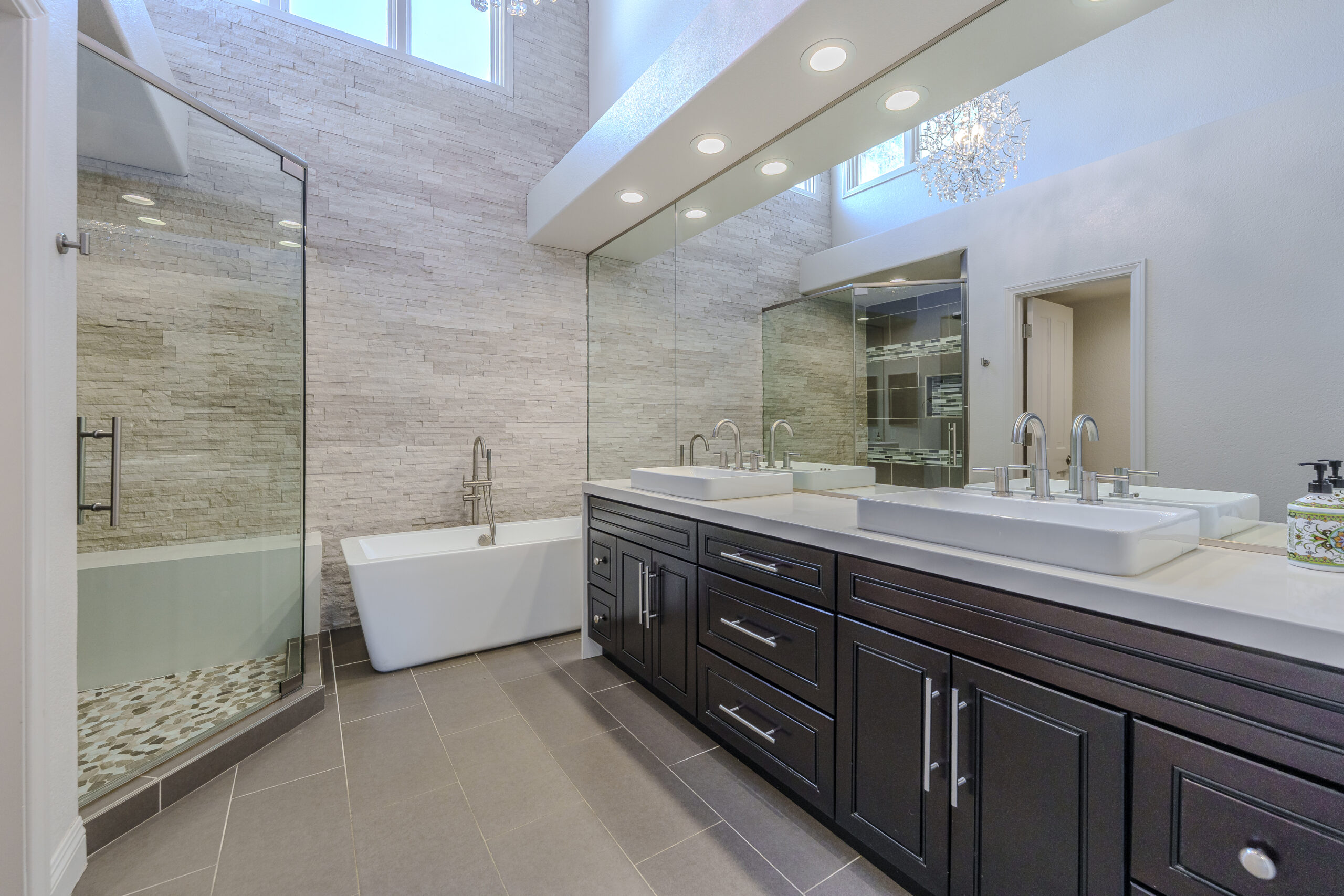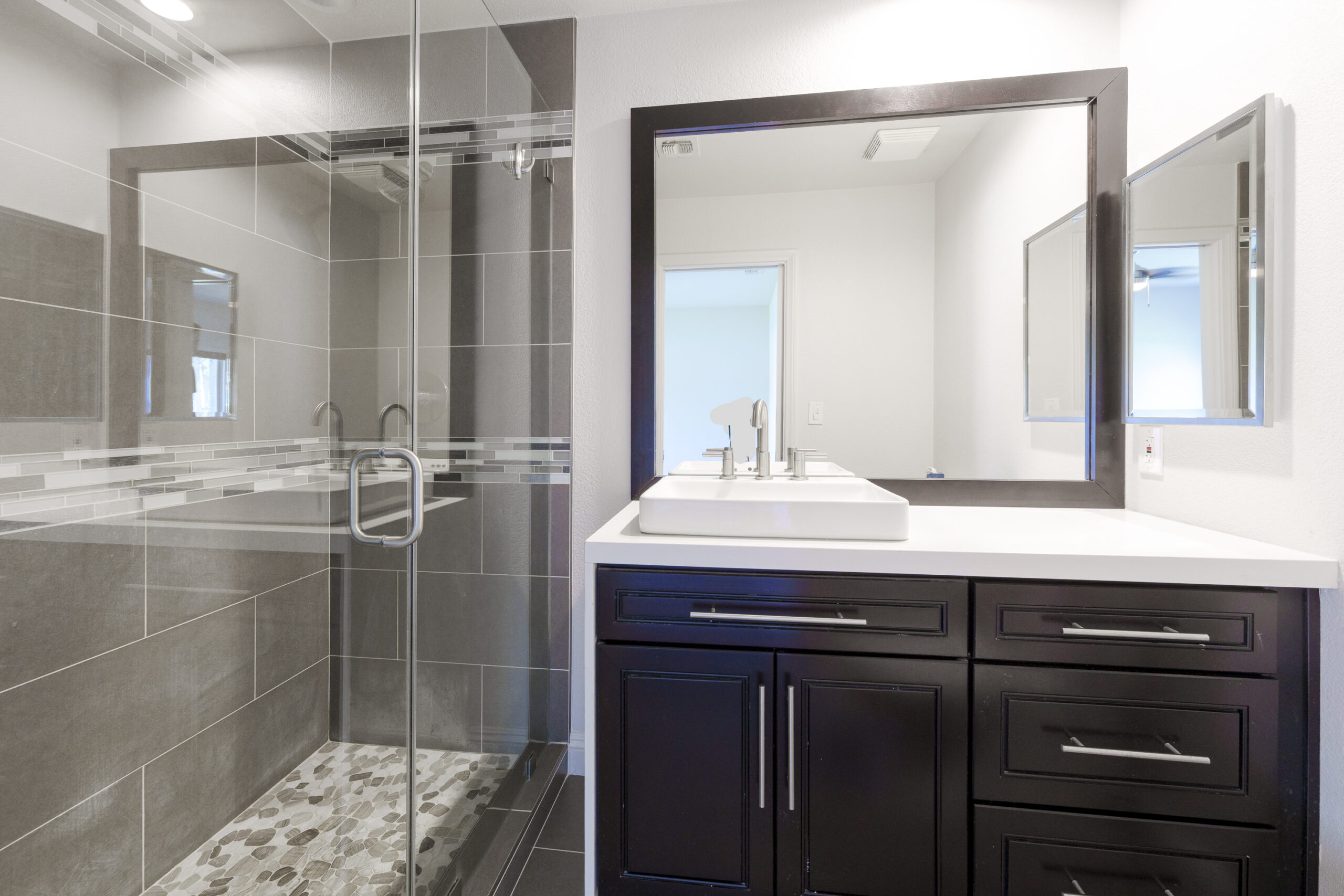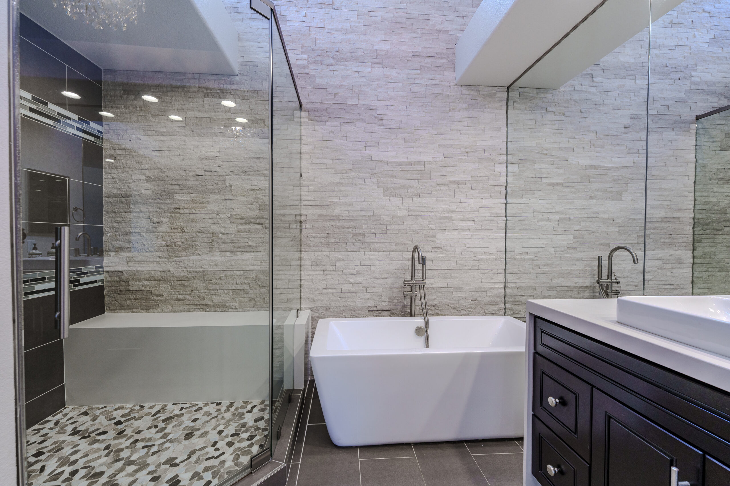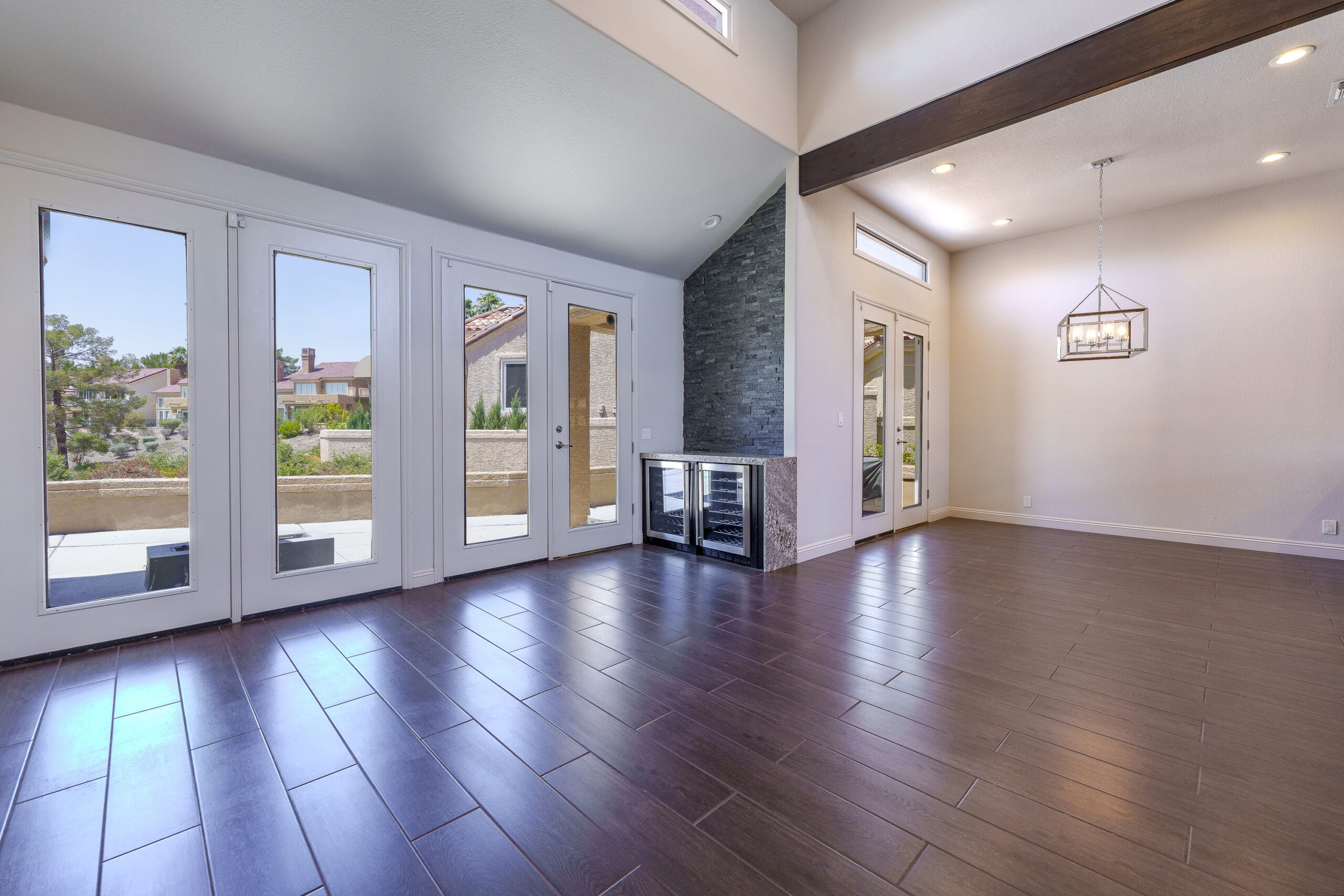 With vaulted ceilings and custom lighting, the space feels open and inviting. The gourmet kitchen is designed for modern living, boasting stone countertops with a waterfall edge, custom cabinets, KitchenAid appliances, and a five-burner gas cooktop. The spacious primary bedroom is complemented by an updated primary bathroom, which includes a freestanding tub, stone walls, and new cabinets, sinks, and faucets.