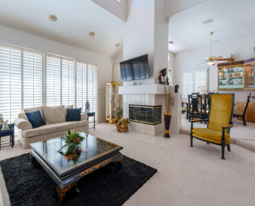 Step through a private courtyard entry into a bright, open floor plan defined by vaulted ceilings and premium finishes. The sunken living room features a cozy gas fireplace, perfectly mirrored by a second fireplace in the primary suite for ultimate relaxation.