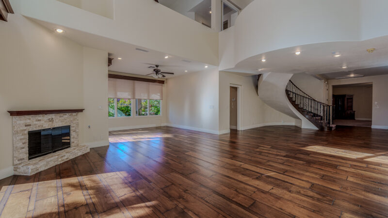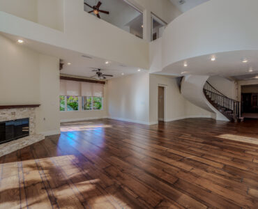 Grand Architecture: Spiral iron staircase, 2-story vaulted family room, hardwood floors, and plantation shutters.