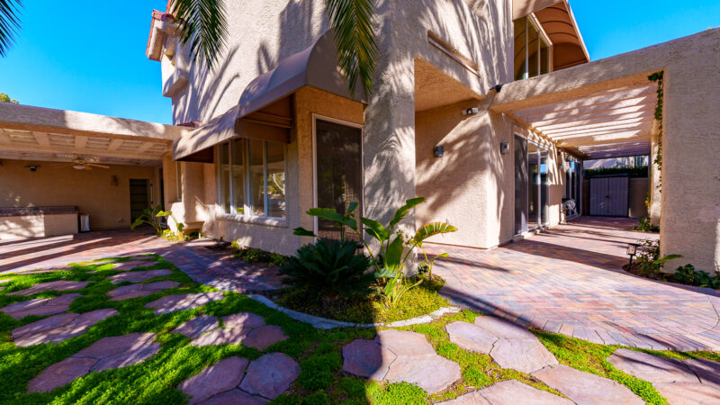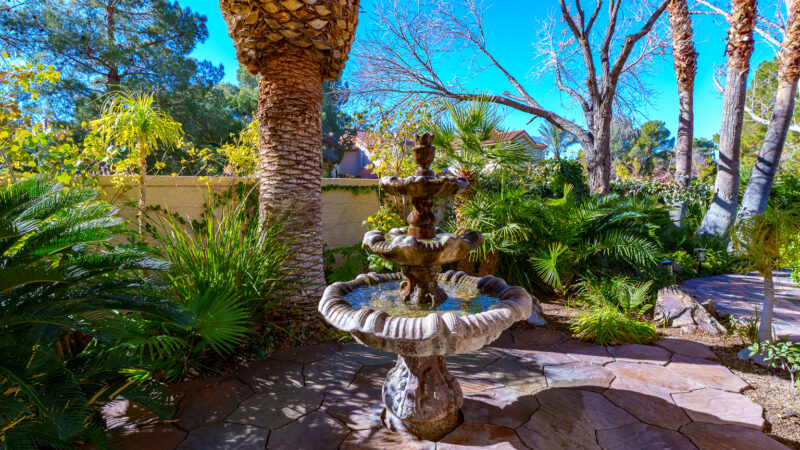 Oasis Backyard: Lush landscaping, fountain, built-in BBQ island, and paver patio.